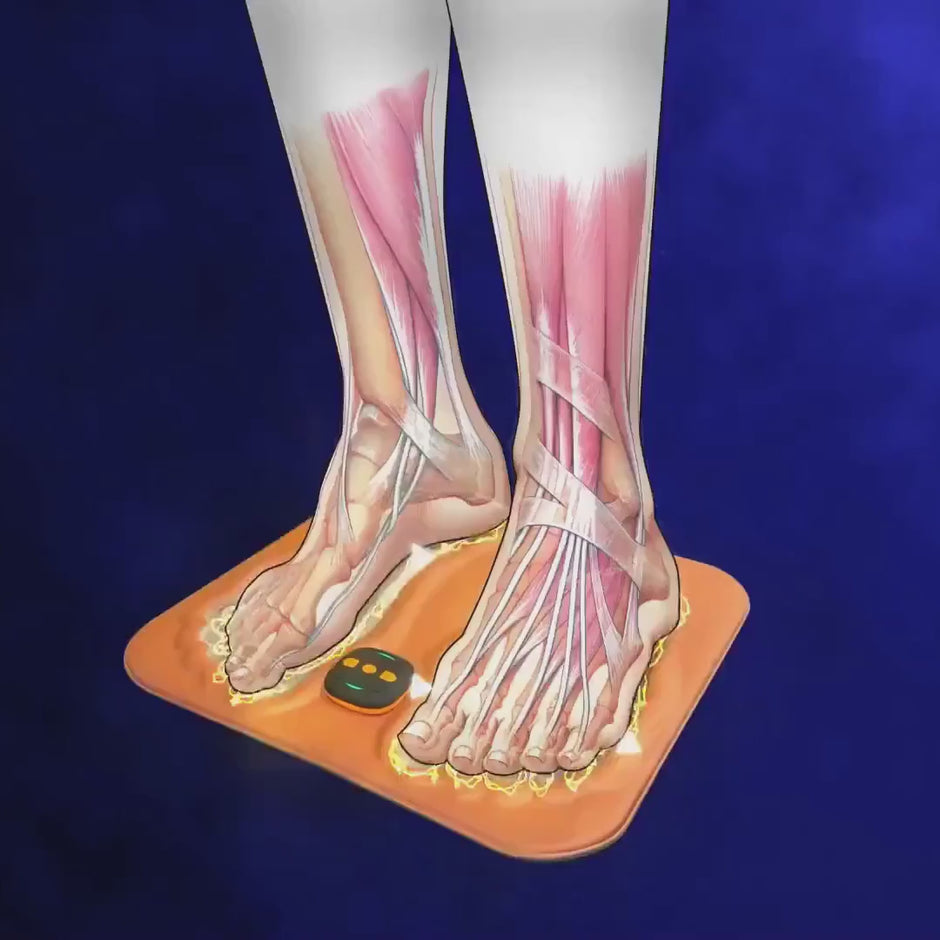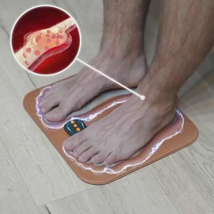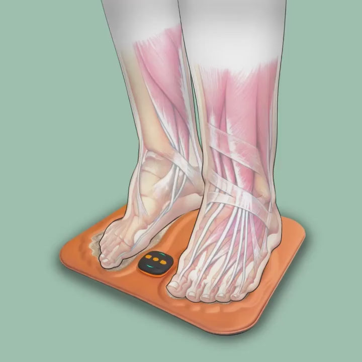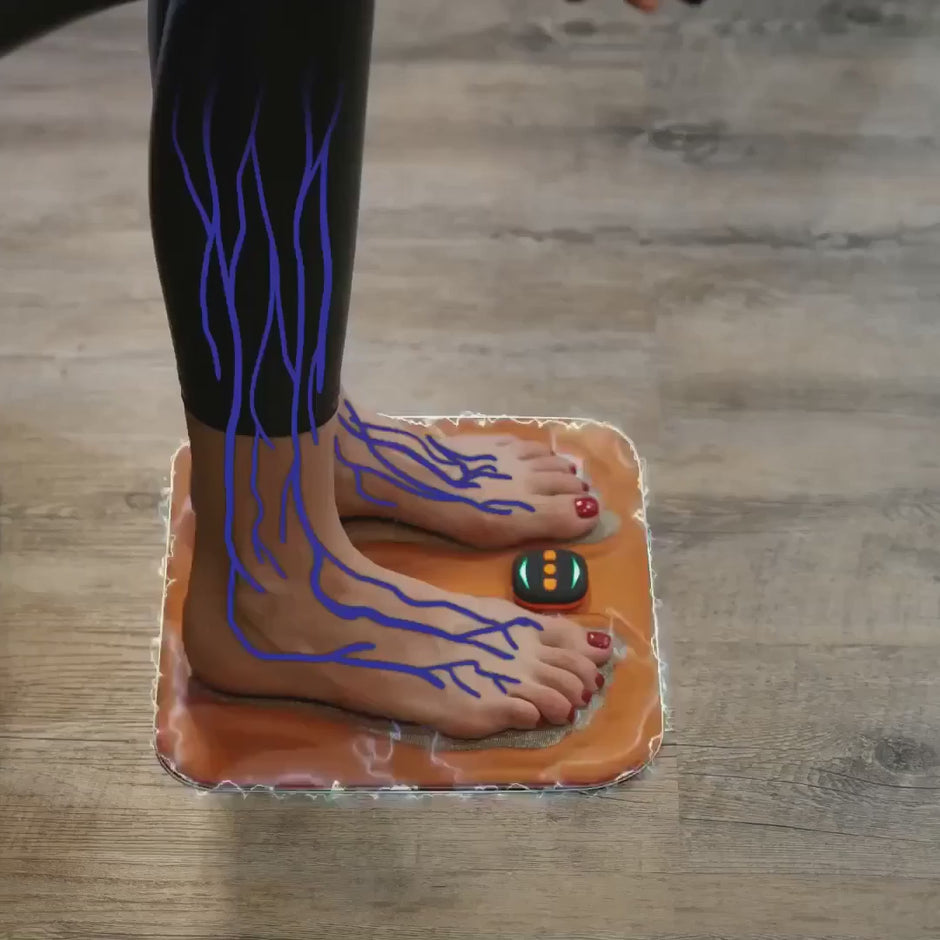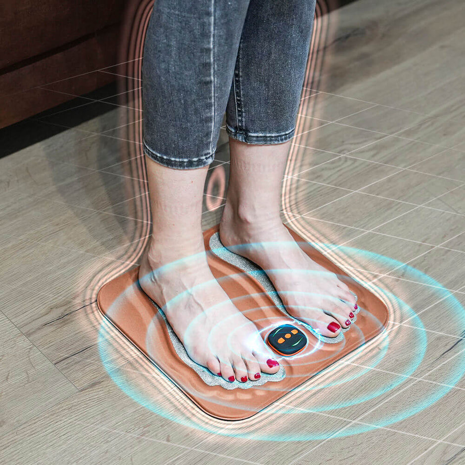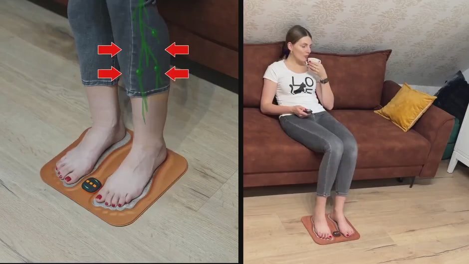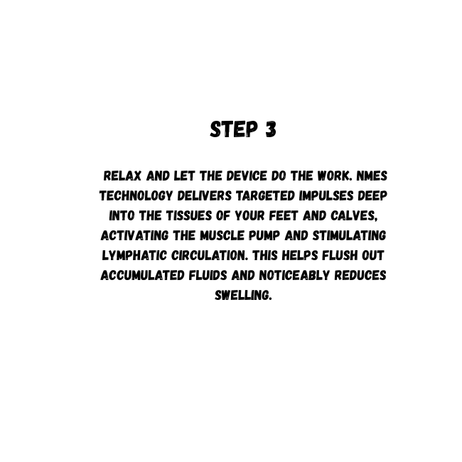 When you place your feet on the NMES stimulator, the CalmPulse™ device sends targeted electrical impulses to the muscles in your calves. This activates them and starts moving blood from the lower body back toward your heart.Normally, you would need to go for a walk or exercise, but with the CalmPulse™ device, you can do this from the comfort of your couch, for example while watching TV.As soon as the calf muscles are reactivated, blood circulation throughout the lower body noticeably increases for a short period — and the old stagnant blood that has accumulated in the feet and ankles begins to flow away, reducing swelling.