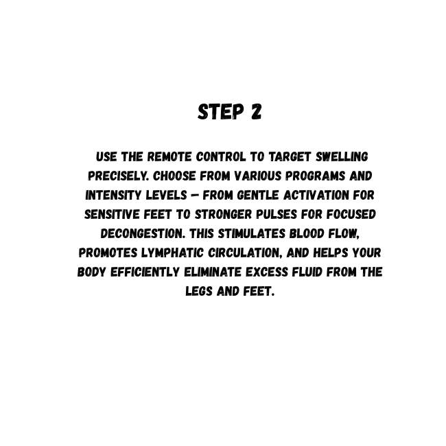 Unlike conventional foot massagers, which barely affect beyond the surface of the skin, the CalmPulse™ specifically activates the calf muscles — an area doctors also call the “second heart.”Precise electrical impulses stimulate the calves to pump accumulated blood from the feet back to the heart.The result:Visible reduction in swelling of the feet and ankles, along with relief from sensations of pressure and tension — all while sitting comfortably and effortlessly.The built-in copper fiber technology provides particularly deep and effective stimulation, unmatched by conventional devices. It significantly improves blood circulation and efficiently removes excess fluid accumulated in the legs.